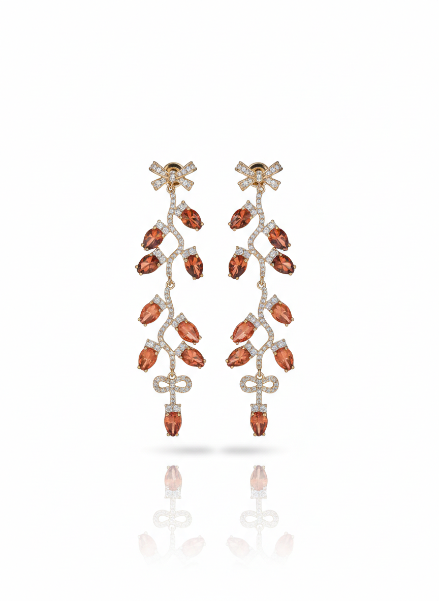 golden hour energy. these 7cm extra-long dangles feature a delicate, vine-like design crafted in polished gold-tone metal. adorned with warm amber-toned marquise crystals and tiny sparkling accents, they finished with adorable bow details for a coquette-meets-glam aesthetic.