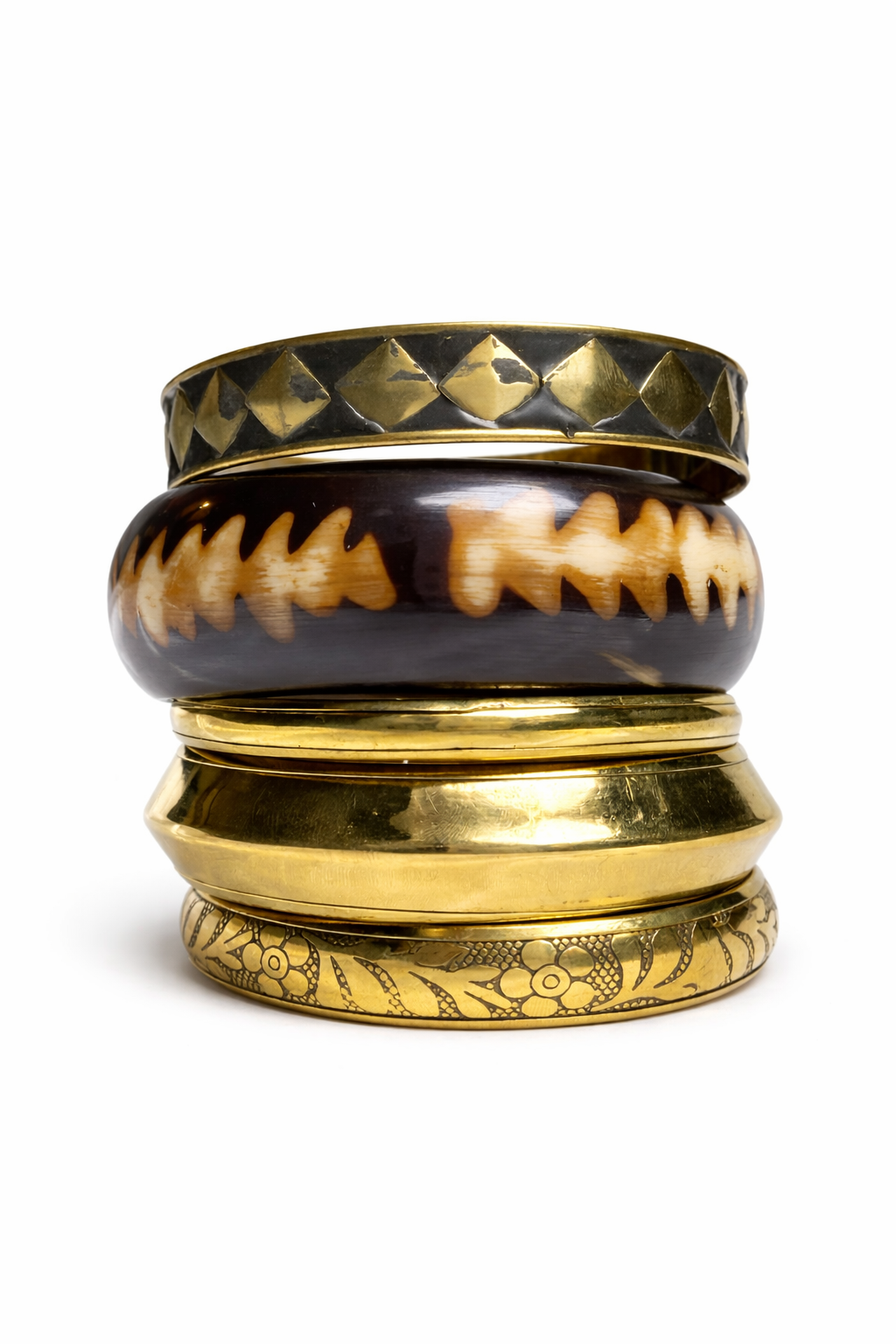 collected, cool, and effortlessly chic. this stack mixes etched gold tones with bold geometric patterns for a look that feels like a rare find from a far-off place. wear them all for maximum impact or solo for a subtle vibe.